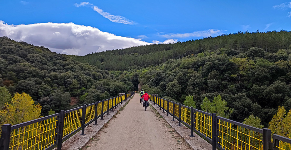 Vous vous enfoncez dans les forêts typiques de la région et profitez des charmantes petites villes qu’offre cette région. Ce premier tronçon est conditionné par le tunnel de Laminoria (2195 m.), actuellement non accessible. Pour l’éviter, nous vous proposons de faire un léger détour par une route sans circulation ou par un chemin de montagne pour les plus experts. Vous pédalez au cœur de la forêt verdoyante de la montagne d’Alavesa. Vous descendez ensuite vers le col de Guereñu et revenez sur la voie verte. Après la traversée d’un tunnel, vous arrivez à Maestu, un des villages les plus étendus de la région. Parmi ces monuments, vosu découvrez le palais rural des Samaniego, une exceptionnelle ouvre baroque du XVIIième siècle, et l’église dédiée à l’Invención de la Santa Cruz dont le clocher possède une horloge singulière avec un personnage mécanique.