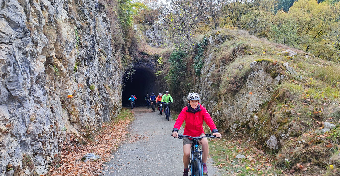 Enfourchez votre vélo et tracez votre chemin hors de la capitale de la Navarre. À mesure que vous vous éloignez, le majestueux Mont San Cristóbal garde un œil vigilant sur votre périple. Vous atteingnez la voie verte Plazaola. Les premiers kilomètres de cette piste pittoresque vous mènent en douce ascension, dévoilant peu à peu le panorama captivant qui vous entoure, jusqu’à parvenir à l’ancienne gare de Lekunberri.
