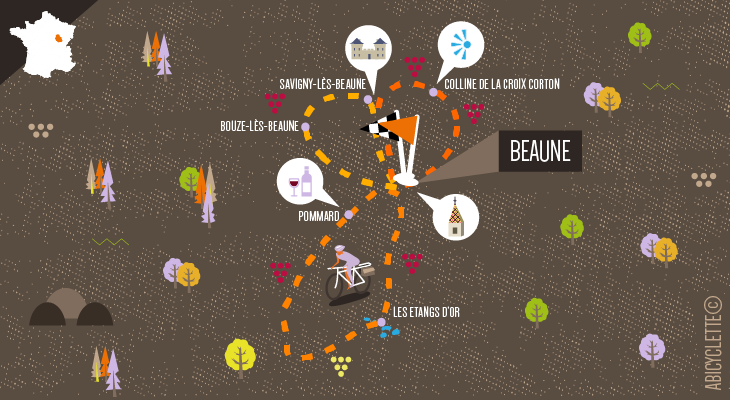 Vous quittez Beaune en direction de l’ouest. Entre vignes et forêts, vous pédalez jusqu’à Bouze-lès-Beaune. Vous contournez la montagne de Beaune pour atteindre le village de Savigny-lès-Beaune. Vous y découvrez le château de Savigny-lès-Beaune, château fort du XIVᵉ siècle situé sur un domaine viticole de 20 hectares du vignoble de la côte de Beaune.