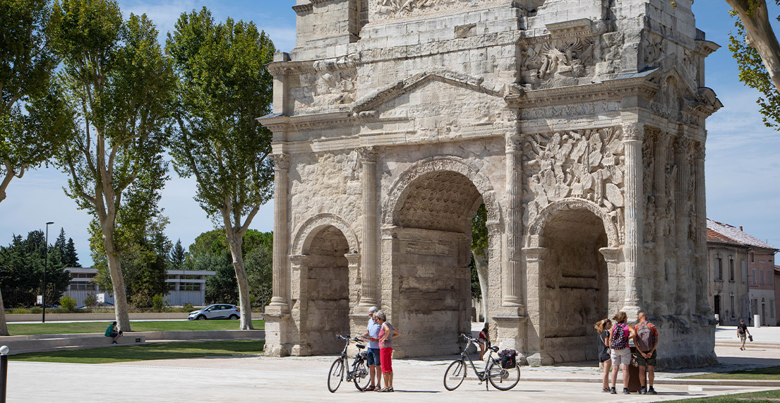 You ride back to Orange, mainly using the Voie Venaissia, a cycling route built on the old railway tracks between Carpentras and Orange. Contemplate the agricultural and winegrowing landscapes of Comtat Venaissin, the magnificent panoramas of the Dentelles de Montmirail Massif and the Mont Ventoux.