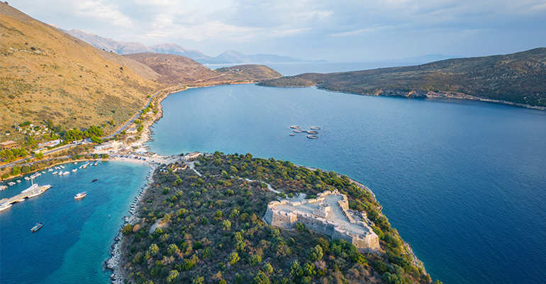 You leave Sarandë following EuroVelo 8, with the Ionian Sea soon running alongside the route while the mountains frame the background. The road climbs towards Shënvasili, opening up wide coastal views, then descends through Lukovë and Piqeras, set among terraced olive groves and small coves. In Borsh, whose olive oil is the most renowned in Albania, you ride along the longest beach on the Albanian Riviera, overlooked by the ruins of its medieval castle, with local producers selling their harvest by the roadside. You then continue to Qeparo Fushë, at the foot of a hilltop village, before skirting the Porto Palermo peninsula, where its 19th-century Venetian fortress stands above the water. The final kilometres roll between cliffs and small beaches to Himarë, a former fishing village set between the hills and the sea.