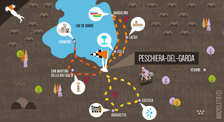 In search of the best places to enjoy the panoramic views of the lake, the route heads inland, passing through typical villages such as Colà, famous for its hot springs. It then heads towards the shores of the lake as far as Lazise. Cycle along the coast to Bardolino. Take your time to appreciate