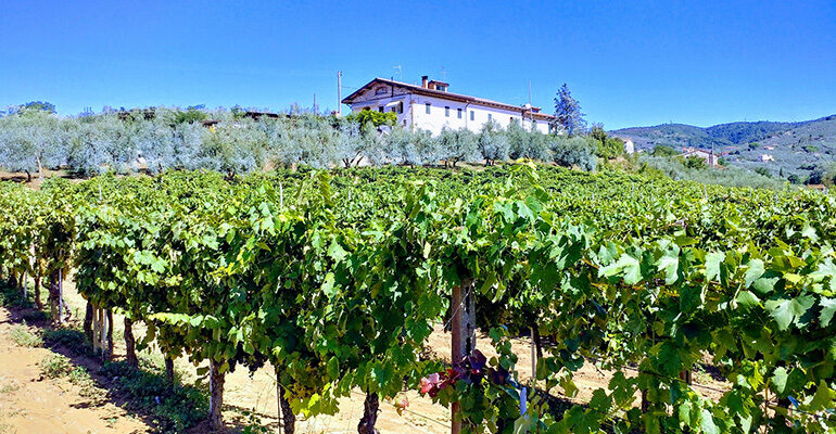 The winding roads cross fields of vineyards and olive trees. Then the hills begin to grow smaller. You enter the Arno valley, cross the river and go up to Vinci.