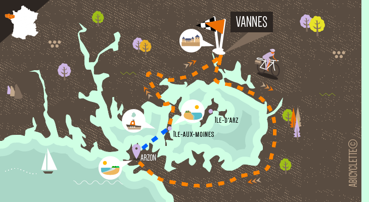 You cycle on the peninsula of Séné, a few kilometers at the end of the Gulf surrounded by birds. A “passeur” boat then allows you to reach the peninsula of Rhuys. You ride along the southern shores of the small sea to reach Arzon.