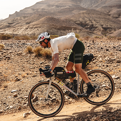 C’est dans cette vallée que l’itinéraire choisi par l’organisation nous amène à quitter la route pour une piste sablonneuse. Cette fois, le soleil s’approchant du zénith, une lumière claire et intense inonde le paysage. Les premières chaleurs se font ressentir. Pas d’arbre, pas d’ombre. Ici c’est le désert. Nous traversons quelques lits asséchés de larges et peu profonds cours d’eau qui demandent un peu d’habileté technique. On passe de nombreuses intersections avec des sentes qui mènent parfois distinctement à des villages, parfois vers des destinations difficiles à percevoir. Le GPS nous oriente, quand il y a un doute, les traces de pneus laissées sur le chemin par la trentaine de concurrents déjà passée, nous évitent de nous arrêter. La quantité de sable par endroit rend difficile la progression et rappelle de loin les obstacles de nos parcours de cyclo-cross hivernaux. Quelques passages donnent lieu à des poussées énergiques sur les pédales pour éviter d’avoir à descendre de vélo. Un excellent entraînement en somme pour la prochaine saison de cyclo-cross ! Je m’amuse de cette piste ludique qui semble de nouveau infinie. Rouler, piloter dans ce paysage unique est un vrai moment de joie. J’apprécie la chance de rouler ici, j’apprécie la valeur de ces kilomètres de piste.